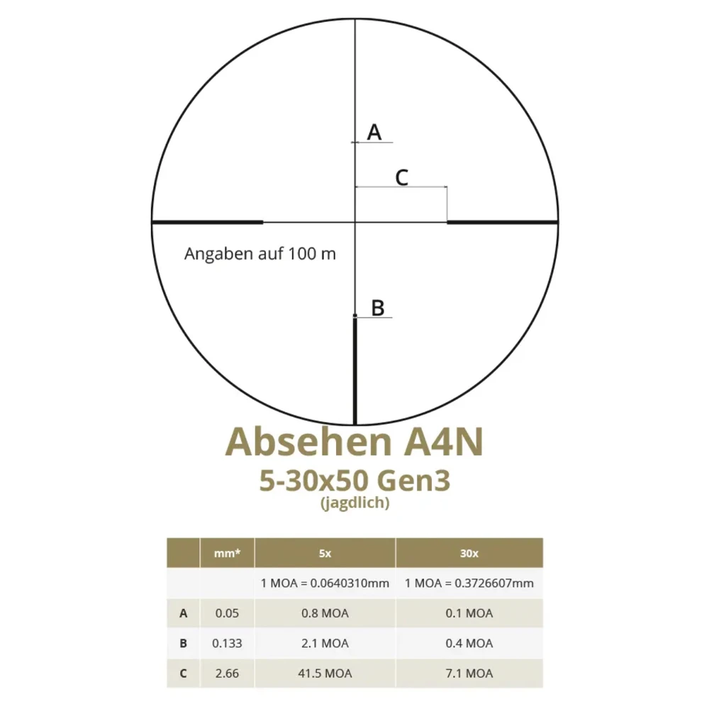 Beim Blick durch die neue Zielfernrohr -Generation III erkennt der Betrachter sofort das praxisgerechte Design: Das Fadenkreuz im Absehen 4 ist sehr viel feiner und die etwas dickeren äußeren Balken sind nur noch halb so dick und stehen deutlich weiter auseinander. Mit großem Vorteil insbesondere für den Jäger bei schlechten Lichtverhältnissen, da das Ziel nur minimal verdeckt und somit ein blitzschneller und sicherer Anschlag optimal unterstützt wird.