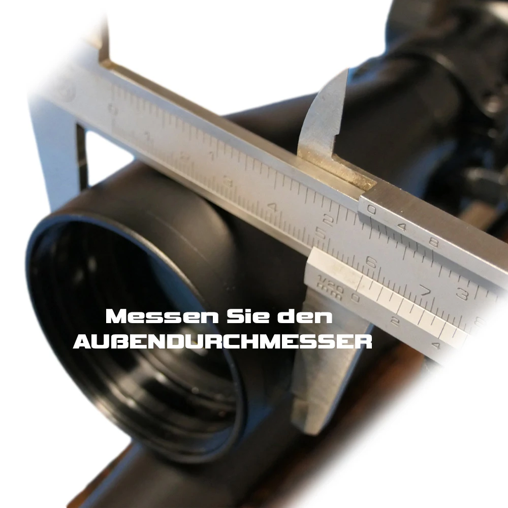 Zur Ermittlung der benötigten Größe der Klemmhülse messen Sie bitte den Außendurchmesser des Objektivs Ihrer Tagesoptik. Der ermittelte Wert stellt exakt die benötigte Größe der Klemmhülse dar.